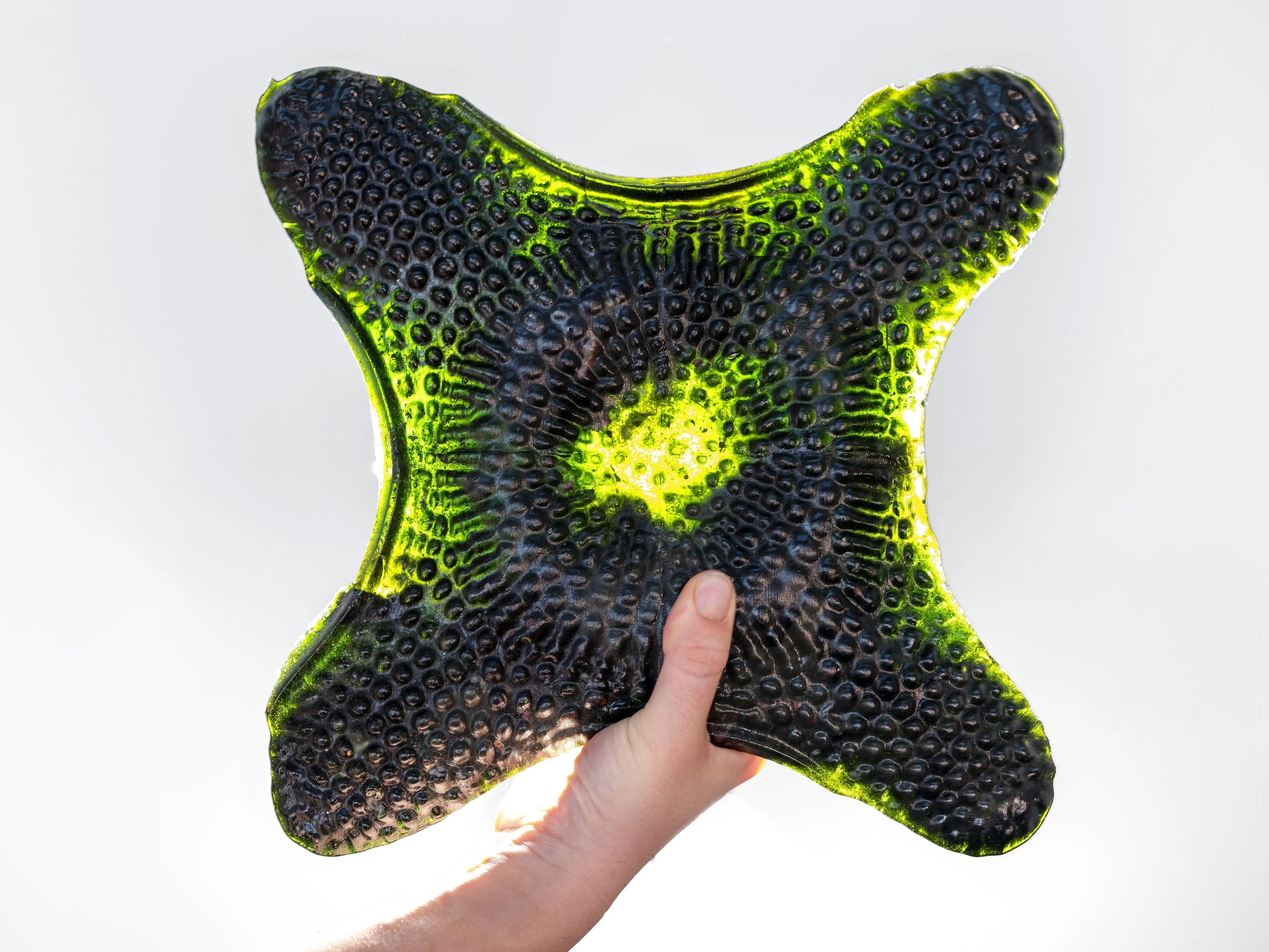 This glass deliberately breaks with this logic. By revealing surface irregularities, it allows light to interact with the material itself rather than pass through an absent medium. These textures echo the nanostructures of algae, which manipulate light for survival, transforming illumination into a tangible, perceptible phenomenon. Light becomes an active participant in the experience of the material, shaping perception while revealing the process of creation. The surface patterns were generated through computational design methods, allowing controlled translation of biological structural principles into material texture.